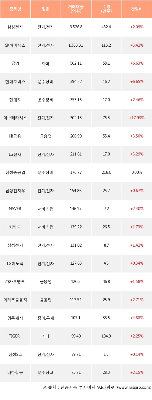 외국인 투자자의 순매수 상위 20개 종목은 삼성전자, SK하이닉스, 금양, 현대모비스, 현대차, 이수페타시스, KB금융, LG전자, 삼성중공업, 삼성전자우등이다.