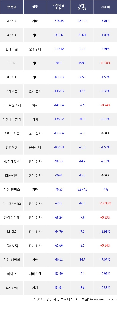 기관 투자자의 순매도 상위 20개 종목은 KODEX 200선물인버스2X, KODEX 코스닥150선물인버스, 현대로템, TIGER 2차전지소재Fn, KODEX 인버스, LX세미콘, 코스모신소재, 두산에너빌리티, LG에너지솔루션, 한화오션등이다.