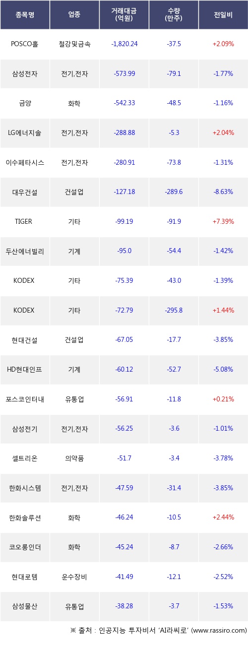외국인 투자자의 순매도 상위 20개 종목은 POSCO홀딩스, 삼성전자, 금양, LG에너지솔루션, 이수페타시스, 대우건설, TIGER 2차전지소재Fn, 두산에너빌리티, KODEX 레버리지, KODEX 200선물인버스2X등이다.