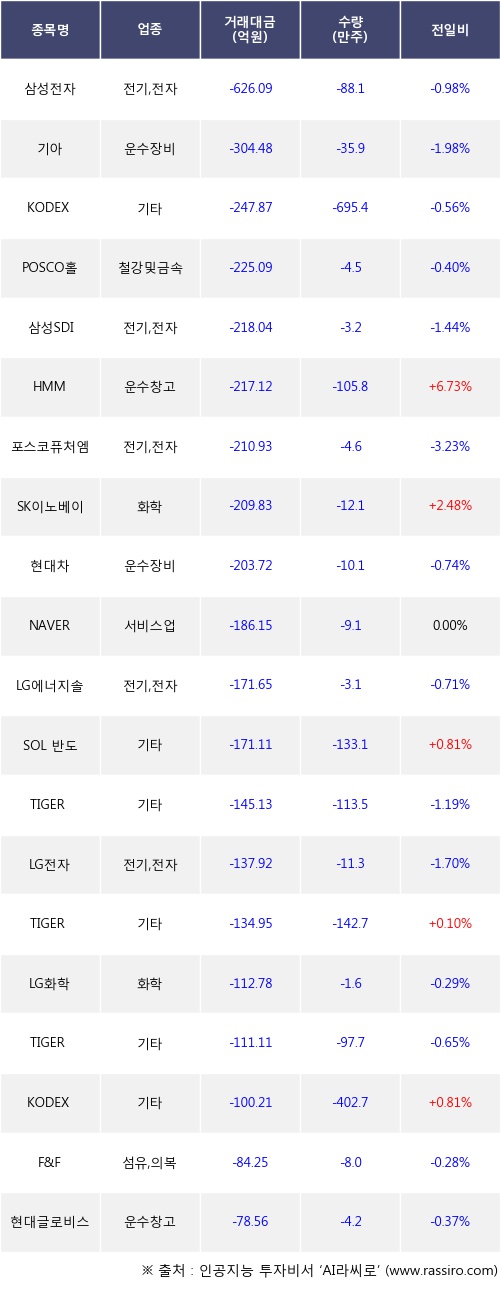 기관 투자자의 순매도 상위 20개 종목은 삼성전자, 기아, KODEX 코스닥150선물인버스, POSCO홀딩스, 삼성SDI, HMM, 포스코퓨처엠, SK이노베이션, 현대차, NAVER등이다.