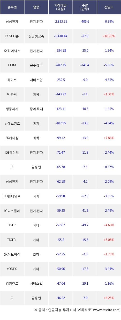 외국인 투자자의 순매도 상위 20개 종목은 삼성전자, POSCO홀딩스, SK하이닉스, HMM, 하이브, LG화학, 영풍제지, 씨에스윈드, SK케미칼, DB하이텍등이다.