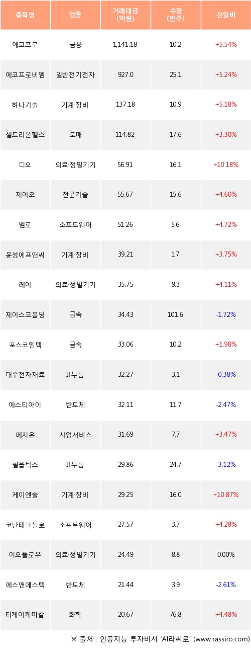 외국인 투자자의 순매수 상위 20개 종목은 에코프로, 에코프로비엠, 하나기술, 셀트리온헬스케어, 디오, 제이오, 엠로, 윤성에프앤씨, 레이, 제이스코홀딩스등이다.