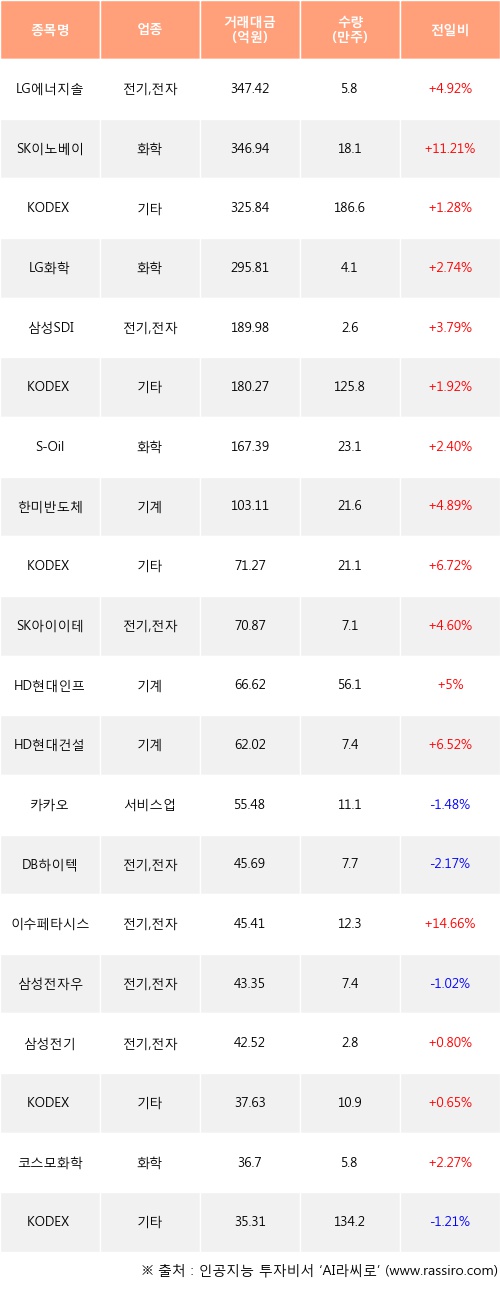 LG에너지솔루션, SK이노베이션, KODEX 레버리지 등은 전일 대비 주가가 상승했고, 카카오, DB하이텍, 삼성전자우 등은 주가가 하락했다.