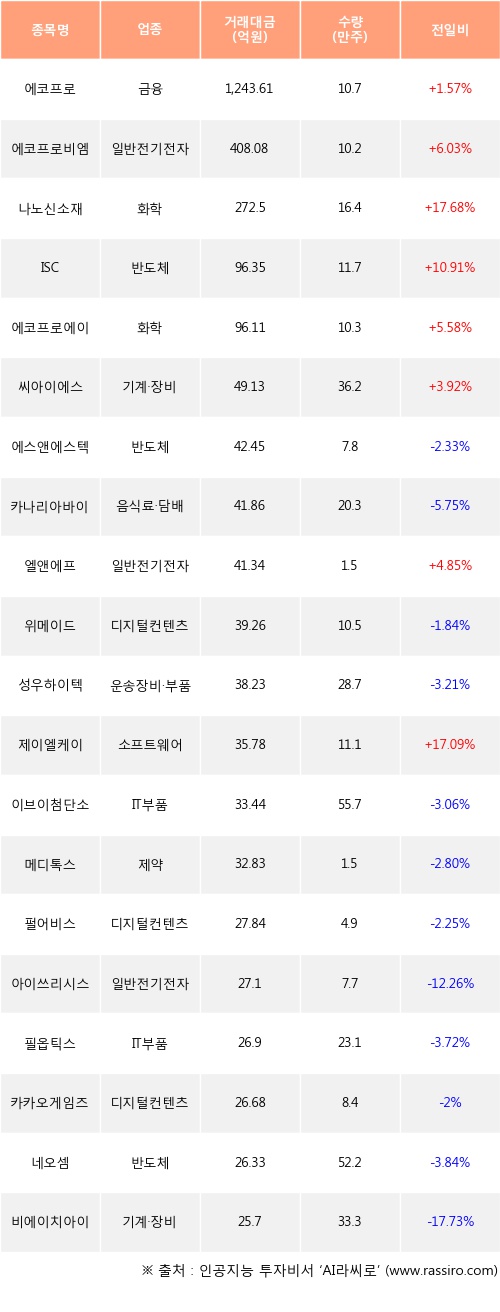 외국인 투자자의 순매수 상위 20개 종목은 에코프로, 에코프로비엠, 나노신소재, ISC, 에코프로에이치엔, 씨아이에스, 에스앤에스텍, 카나리아바이오, 엘앤에프, 위메이드등이다.