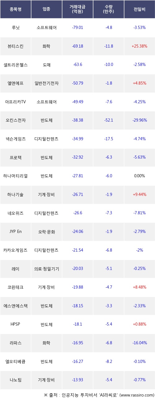 기관 투자자의 순매도 상위 20개 종목은 루닛, 뷰티스킨, 셀트리온헬스케어, 엘앤에프, 아프리카TV, 오킨스전자, 넥슨게임즈, 프로텍, 하나머티리얼즈, 하나기술등이다.