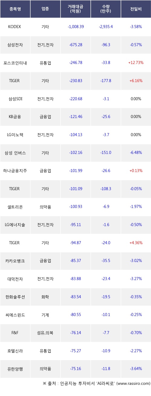 기관 투자자의 순매도 상위 20개 종목은 KODEX 코스닥150선물인버스, 삼성전자, 포스코인터내셔널, TIGER 2차전지소재Fn, 삼성SDI, KB금융, LG이노텍, 삼성 인버스 2X 코스닥150 선물 ETN, 하나금융지주, TIGER Fn반도체TOP10등이다.