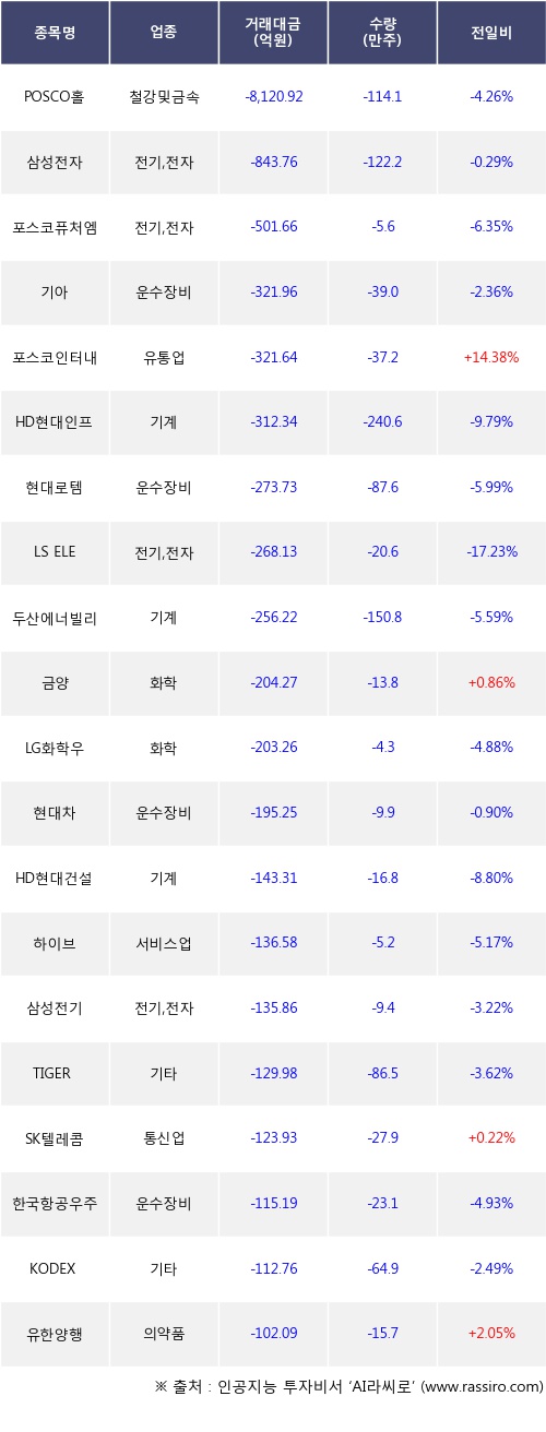 외국인 투자자의 순매도 상위 20개 종목은 POSCO홀딩스, 삼성전자, 포스코퓨처엠, 기아, 포스코인터내셔널, HD현대인프라코어, 현대로템, LS ELECTRIC, 두산에너빌리티, 금양등이다.