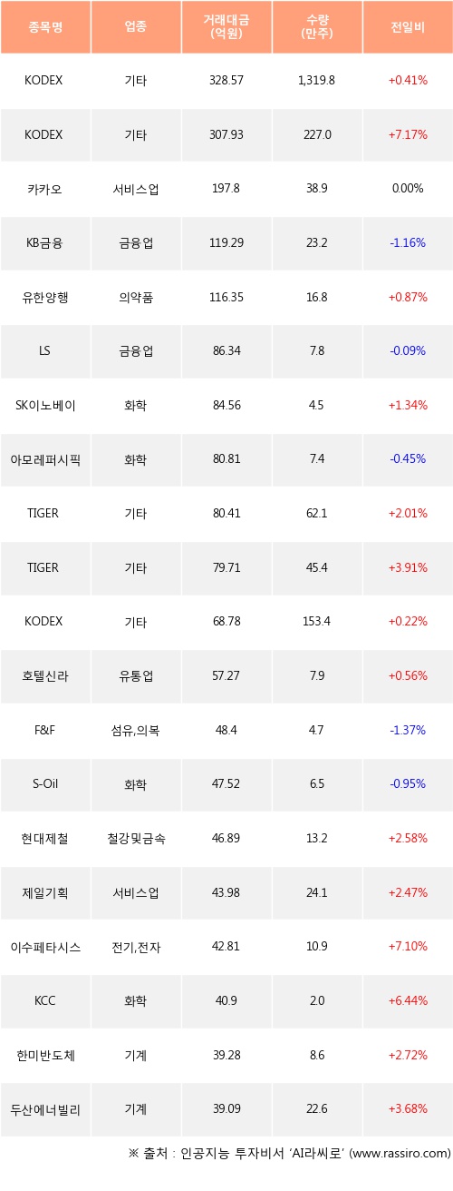 KODEX 200선물인버스2X, KODEX 코스닥150레버리지, 유한양행 등은 전일 대비 주가가 상승했고, KB금융, LS, 아모레퍼시픽 등은 주가가 하락했다.