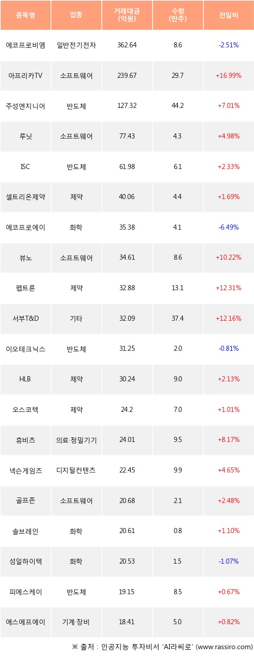 아프리카TV, 주성엔지니어링, 루닛 등은 전일 대비 주가가 상승했고, 에코프로비엠, 에코프로에이치엔, 이오테크닉스 등은 주가가 하락했다.