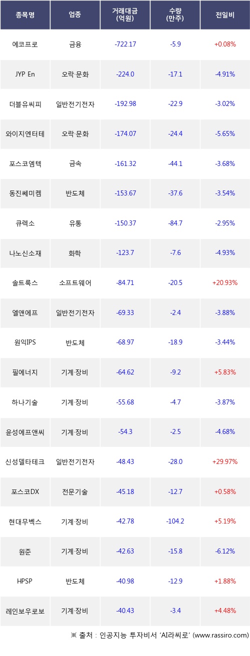 외국인 투자자의 순매도 상위 20개 종목은 에코프로, JYP Ent., 더블유씨피, 와이지엔터테인먼트, 포스코엠텍, 동진쎄미켐, 큐렉소, 나노신소재, 솔트룩스, 엘앤에프등이다.