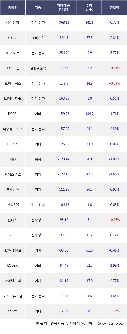 기관 투자자의 순매도 상위 20개 종목은 삼성전자, 카카오, LG이노텍, POSCO홀딩스, SK하이닉스, LG에너지솔루션, TIGER 2차전지소재Fn, 이수페타시스, KODEX 레버리지, LG화학등이다.