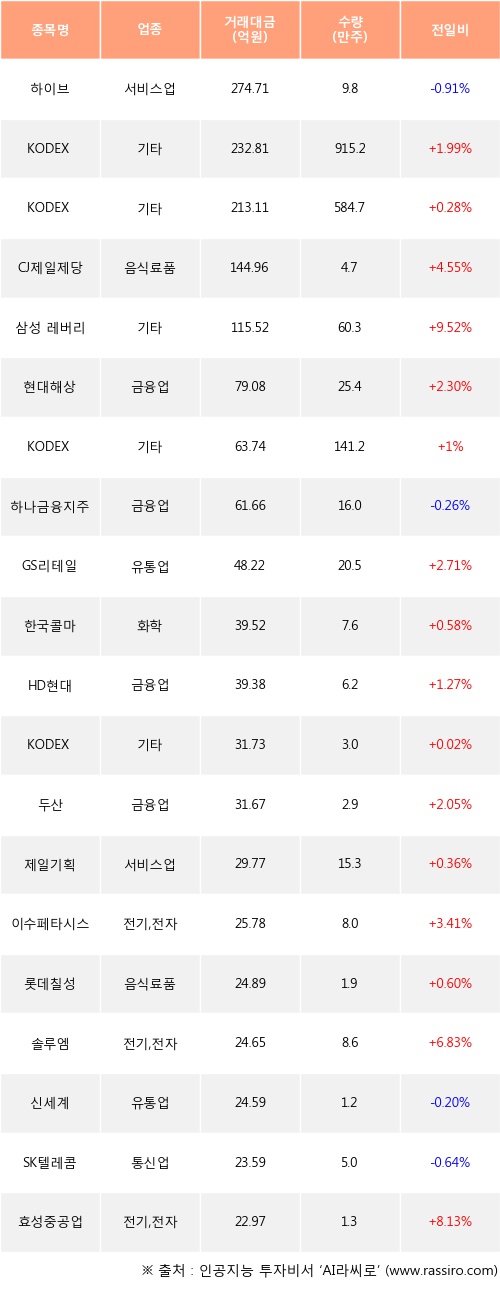 KODEX 200선물인버스2X, KODEX 코스닥150선물인버스, CJ제일제당 등은 전일 대비 주가가 상승했고, 하이브, 하나금융지주, 신세계 등은 주가가 하락했다.