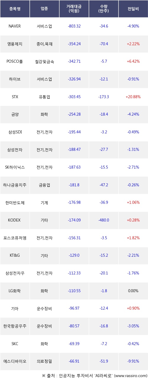 외국인 투자자의 순매도 상위 20개 종목은 NAVER, 영풍제지, POSCO홀딩스, 하이브, STX, 금양, 삼성SDI, 삼성전자, SK하이닉스, 하나금융지주등이다.