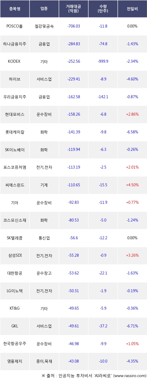 외국인 투자자의 순매도 상위 20개 종목은 POSCO홀딩스, 하나금융지주, KODEX 200선물인버스2X, 하이브, 우리금융지주, 현대모비스, 롯데케미칼, SK이노베이션, 포스코퓨처엠, 씨에스윈드등이다.
