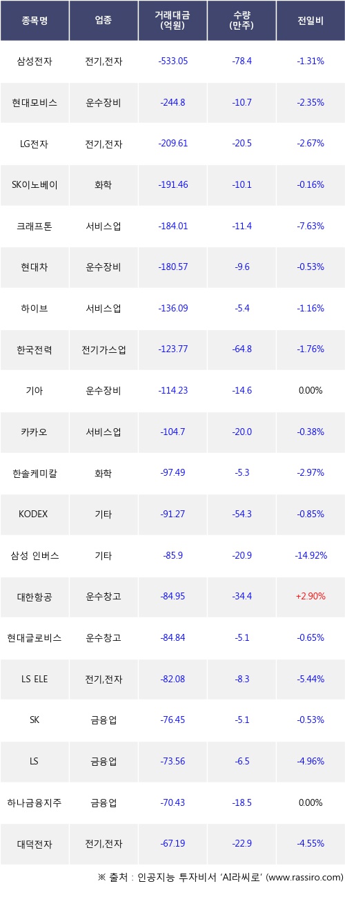 기관 투자자의 순매도 상위 20개 종목은 삼성전자, 현대모비스, LG전자, SK이노베이션, 크래프톤, 현대차, 하이브, 한국전력, 기아, 카카오등이다.