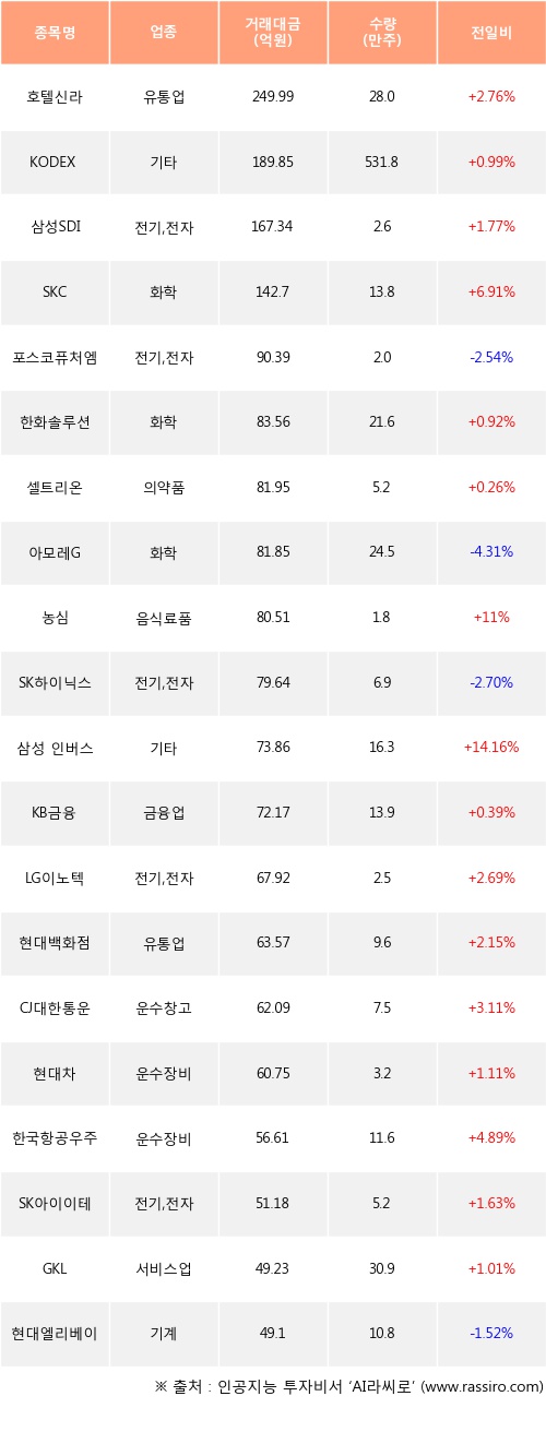 기관 투자자의 순매수 상위 20개 종목은 호텔신라, KODEX 코스닥150선물인버스, 삼성SDI, SKC, 포스코퓨처엠, 한화솔루션, 셀트리온, 아모레G, 농심, SK하이닉스등이다.