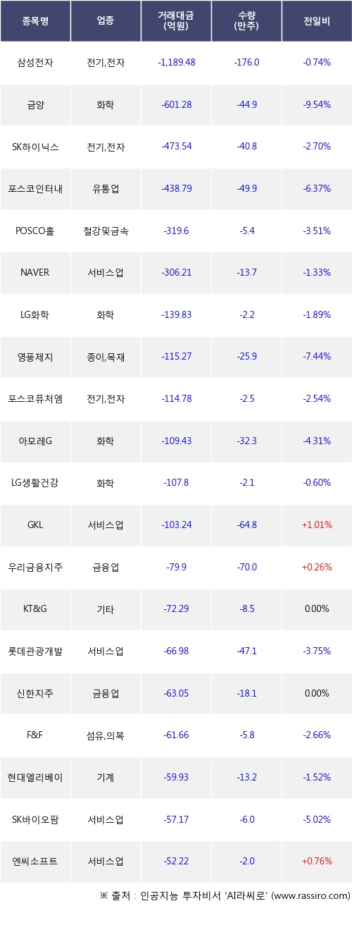 외국인 투자자의 순매도 상위 20개 종목은 삼성전자, 금양, SK하이닉스, 포스코인터내셔널, POSCO홀딩스, NAVER, LG화학, 영풍제지, 포스코퓨처엠, 아모레G등이다.
