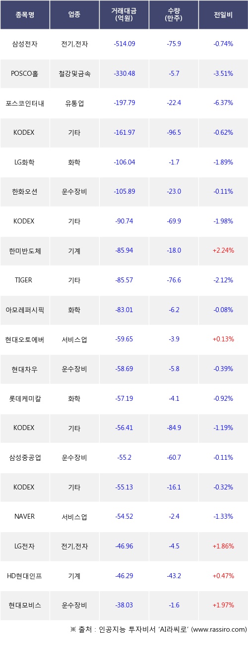 기관 투자자의 순매도 상위 20개 종목은 삼성전자, POSCO홀딩스, 포스코인터내셔널, KODEX 레버리지, LG화학, 한화오션, KODEX 코스닥150레버리지, 한미반도체, TIGER 2차전지소재Fn, 아모레퍼시픽등이다.