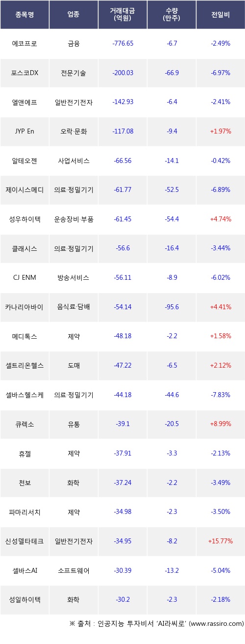 외국인 투자자의 순매도 상위 20개 종목은 에코프로, 포스코DX, 엘앤에프, JYP Ent., 알테오젠, 제이시스메디칼, 성우하이텍, 클래시스, CJ ENM, 카나리아바이오등이다.