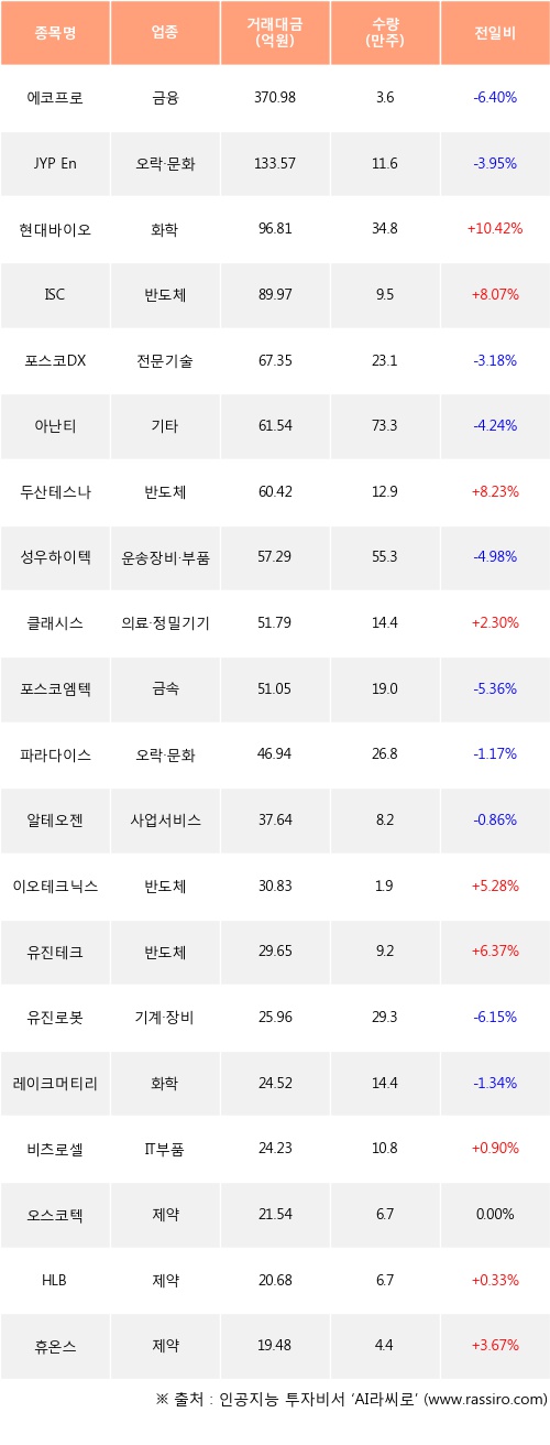 현대바이오, ISC, 두산테스나 등은 전일 대비 주가가 상승했고, 에코프로, JYP Ent., 포스코DX 등은 주가가 하락했다.