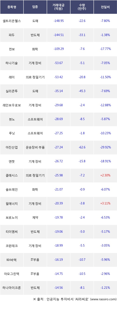 기관 투자자의 순매도 상위 20개 종목은 셀트리온헬스케어, 파두, 천보, 하나기술, 레이, 실리콘투, 레인보우로보틱스, 뷰노, 루닛, 아진산업등이다.