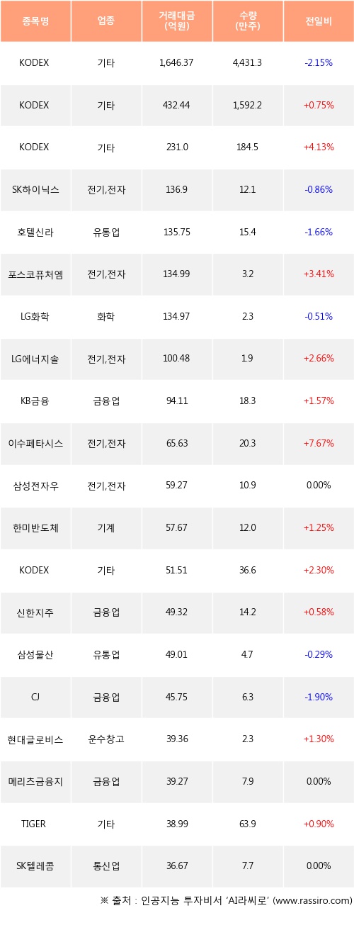KODEX 200선물인버스2X, KODEX 코스닥150레버리지, 포스코퓨처엠 등은 전일 대비 주가가 상승했고, KODEX 코스닥150선물인버스, SK하이닉스, 호텔신라 등은 주가가 하락했다.