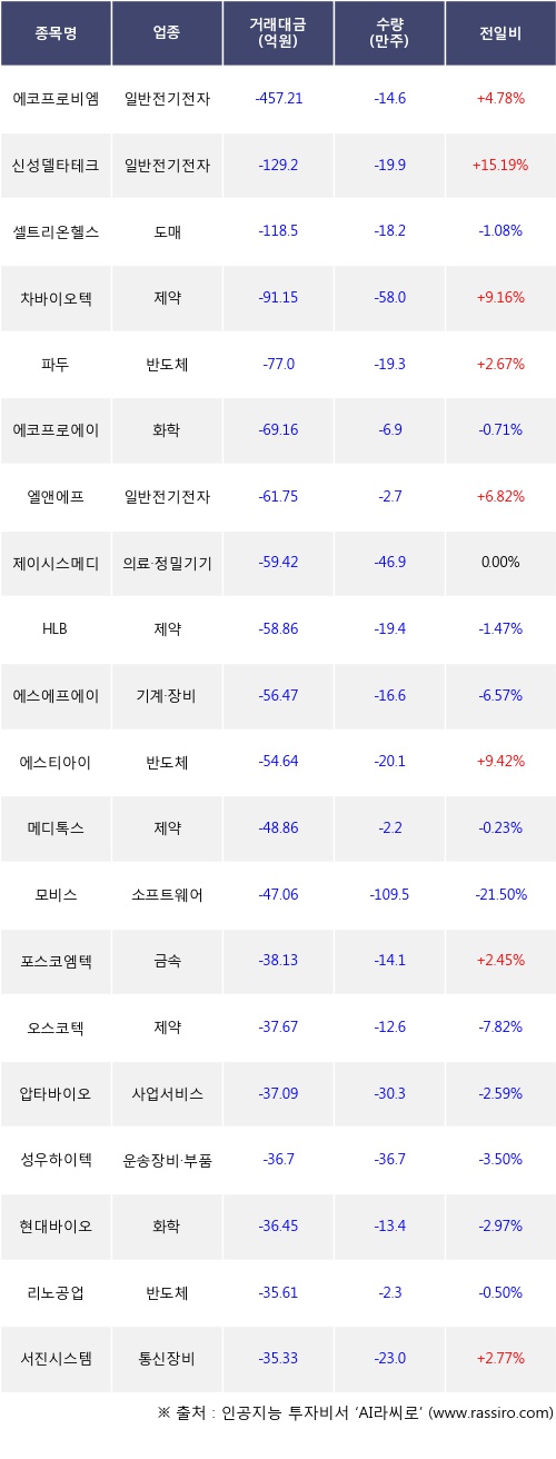 외국인 투자자의 순매도 상위 20개 종목은 에코프로비엠, 신성델타테크, 셀트리온헬스케어, 차바이오텍, 파두, 에코프로에이치엔, 엘앤에프, 제이시스메디칼, HLB, 에스에프에이등이다.