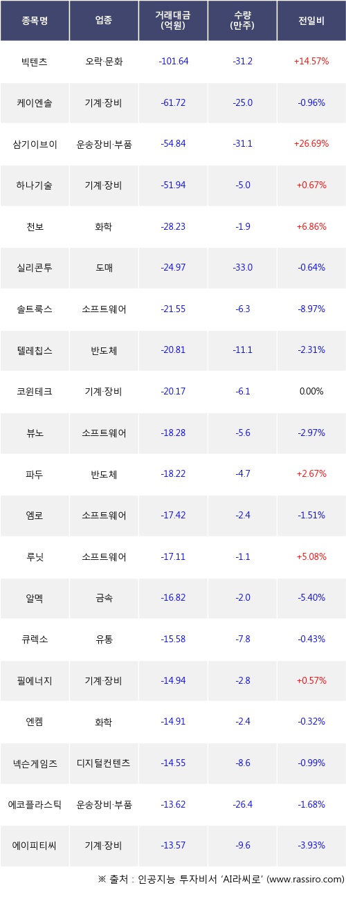 기관 투자자의 순매도 상위 20개 종목은 빅텐츠, 케이엔솔, 삼기이브이, 하나기술, 천보, 실리콘투, 솔트룩스, 텔레칩스, 코윈테크, 뷰노등이다.
