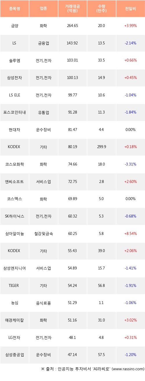 금양, 솔루엠, 삼성전자 등은 전일 대비 주가가 상승했고, LS, LS ELECTRIC, 포스코인터내셔널 등은 주가가 하락했다.