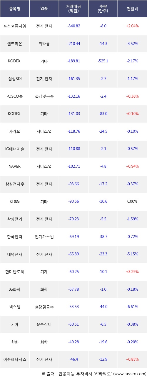 외국인 투자자의 순매도 상위 20개 종목은 포스코퓨처엠, 셀트리온, KODEX 코스닥150선물인버스, 삼성SDI, POSCO홀딩스, KODEX 레버리지, 카카오, LG에너지솔루션, NAVER, 삼성전자우등이다.