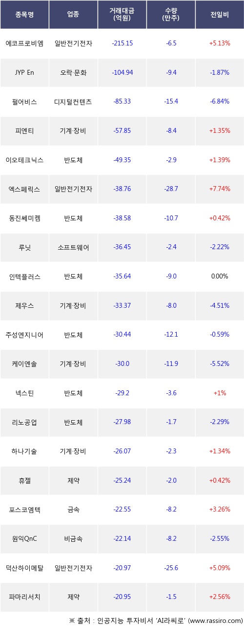 외국인 투자자의 순매도 상위 20개 종목은 에코프로비엠, JYP Ent., 펄어비스, 피엔티, 이오테크닉스, 엑스페릭스, 동진쎄미켐, 루닛, 인텍플러스, 제우스등이다.