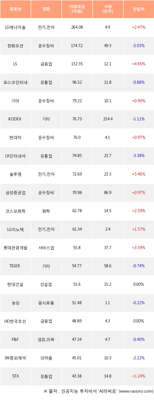 LG에너지솔루션, LS, 기아 등은 전일 대비 주가가 상승했고, 한화오션, 포스코인터내셔널, KODEX 코스닥150선물인버스 등은 주가가 하락했다.
