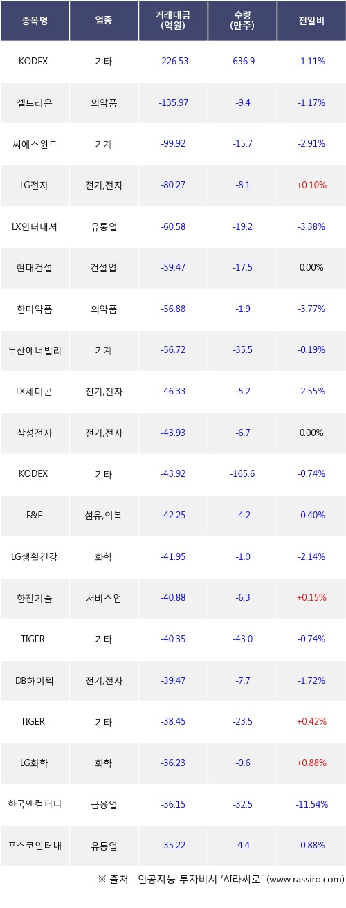 기관 투자자의 순매도 상위 20개 종목은 KODEX 코스닥150선물인버스, 셀트리온, 씨에스윈드, LG전자, LX인터내셔널, 현대건설, 한미약품, 두산에너빌리티, LX세미콘, 삼성전자등이다.