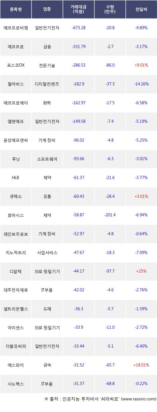 외국인 투자자의 순매도 상위 20개 종목은 에코프로비엠, 에코프로, 포스코DX, 펄어비스, 에코프로에이치엔, 엘앤에프, 윤성에프앤씨, 루닛, HLB, 큐렉소등이다.