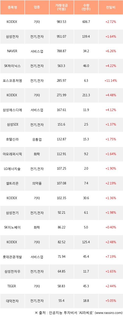 기관 투자자의 순매수 상위 20개 종목은 KODEX 레버리지, 삼성전자, NAVER, SK하이닉스, 포스코퓨처엠, KODEX 코스닥150레버리지, 삼성에스디에스, 삼성SDI, 호텔신라, 아모레퍼시픽등이다.