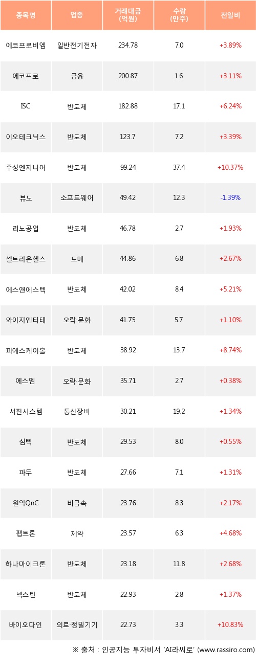 에코프로비엠, 에코프로, ISC 등은 전일 대비 주가가 상승했고, 뷰노 등은 주가가 하락했다.