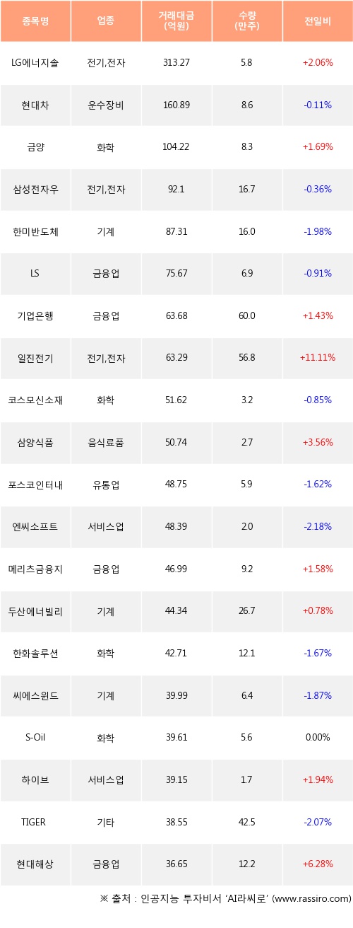 LG에너지솔루션, 금양, 기업은행 등은 전일 대비 주가가 상승했고, 현대차, 삼성전자우, 한미반도체 등은 주가가 하락했다.