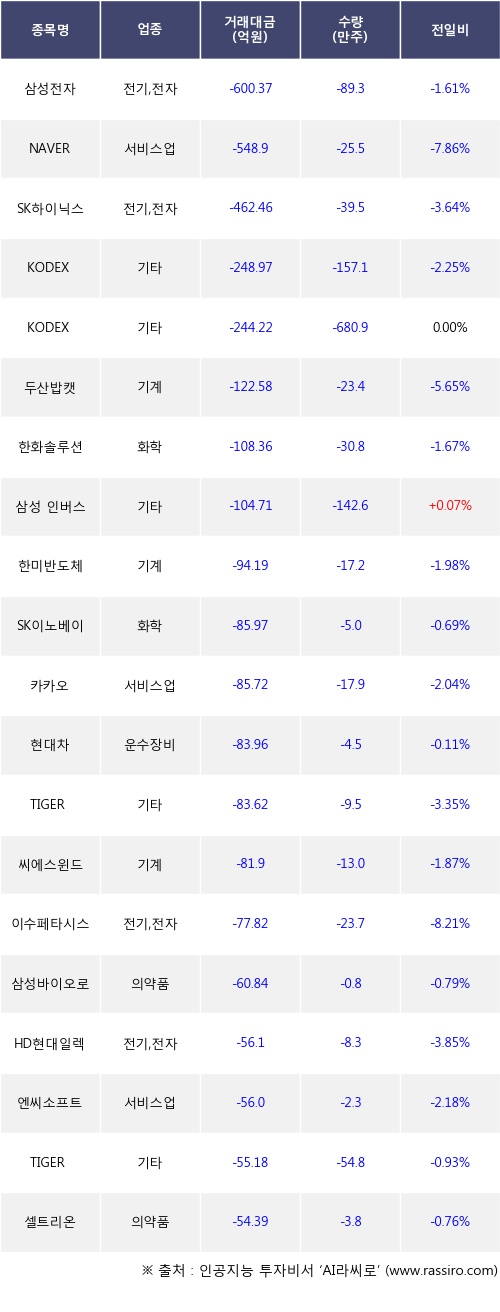 기관 투자자의 순매도 상위 20개 종목은 삼성전자, NAVER, SK하이닉스, KODEX 레버리지, KODEX 코스닥150선물인버스, 두산밥캣, 한화솔루션, 삼성 인버스 2X 코스닥150 선물 ETN, 한미반도체, SK이노베이션등이다.