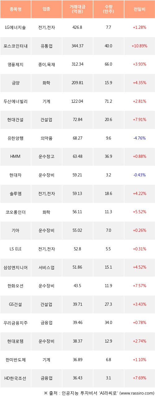 LG에너지솔루션, 포스코인터내셔널, 영풍제지 등은 전일 대비 주가가 상승했고, 유한양행, 현대차 등은 주가가 하락했다.