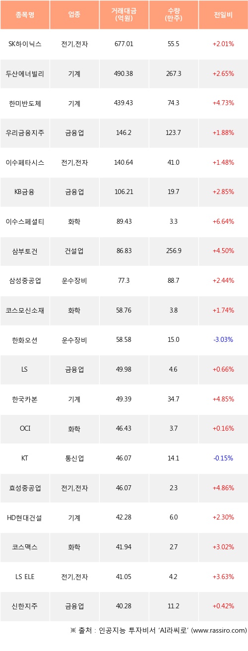 외국인 투자자의 순매수 상위 20개 종목은 SK하이닉스, 두산에너빌리티, 한미반도체, 우리금융지주, 이수페타시스, KB금융, 이수스페셜티케미컬, 삼부토건, 삼성중공업, 코스모신소재등이다.
