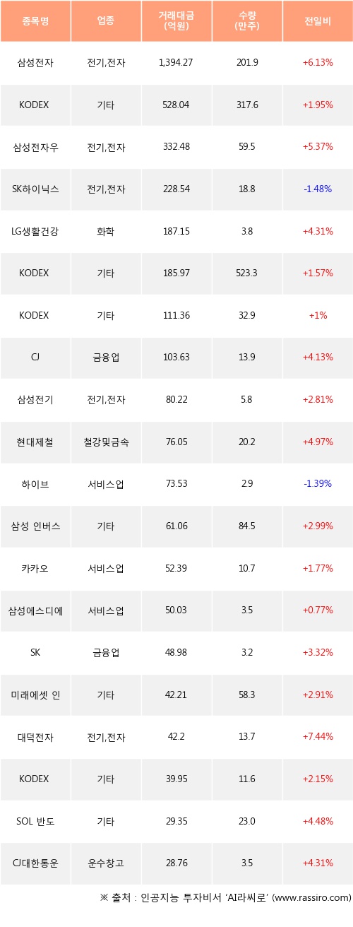 삼성전자, KODEX 레버리지, 삼성전자우 등은 전일 대비 주가가 상승했고, SK하이닉스, 하이브 등은 주가가 하락했다.