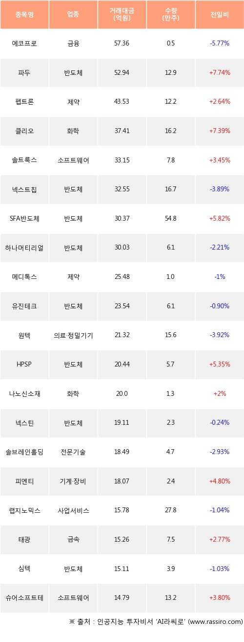 파두, 펩트론, 클리오 등은 전일 대비 주가가 상승했고, 에코프로, 넥스트칩, 하나머티리얼즈 등은 주가가 하락했다.