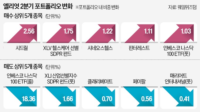 이와 함께 엘리엇은 미국 산업재를 추종하는 XLI산업선별지수 SDPR펀드의 풋옵션 비중을 4.50%에서 2.83%로 줄였다. 전체 포트폴리오의 0.70%를 차지하던 글로벌 정보분석 서비스 기업 클래리베이트와 결제기업인 페이팔(0.56%) 주식도 전량 매각했다.