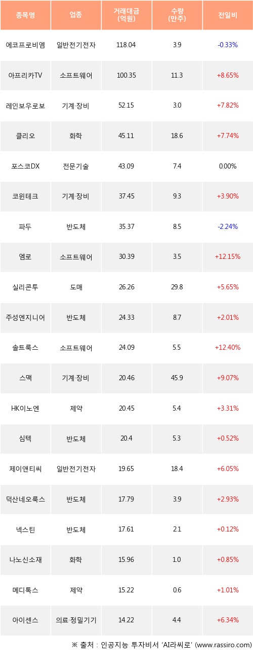 아프리카TV, 레인보우로보틱스, 클리오 등은 전일 대비 주가가 상승했고, 에코프로비엠, 파두 등은 주가가 하락했다.