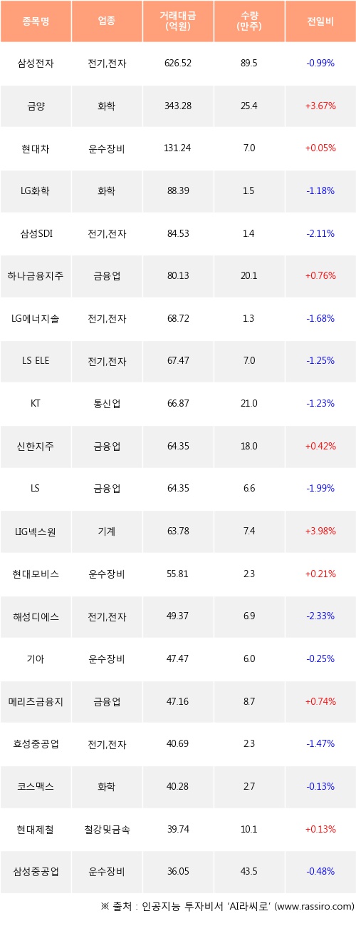 금양, 현대차, 하나금융지주 등은 전일 대비 주가가 상승했고, 삼성전자, LG화학, 삼성SDI 등은 주가가 하락했다.