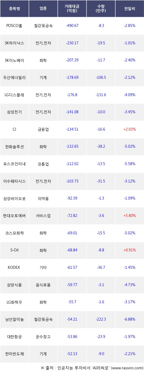 외국인 투자자의 순매도 상위 20개 종목은 POSCO홀딩스, SK하이닉스, SK이노베이션, 두산에너빌리티, LG디스플레이, 삼성전기, CJ, 한화솔루션, 포스코인터내셔널, 이수페타시스등이다.