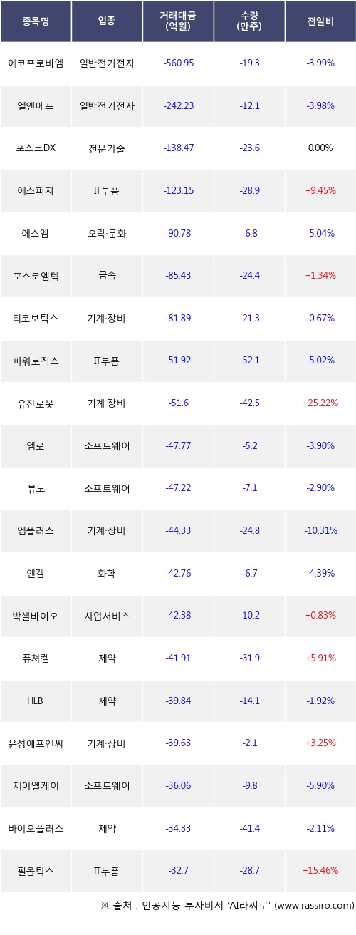 외국인 투자자의 순매도 상위 20개 종목은 에코프로비엠, 엘앤에프, 포스코DX, 에스피지, 에스엠, 포스코엠텍, 티로보틱스, 파워로직스, 유진로봇, 엠로등이다.