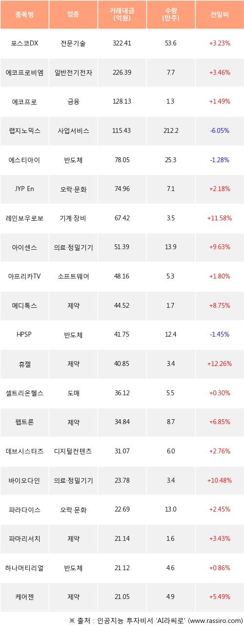 포스코DX, 에코프로비엠, 에코프로 등은 전일 대비 주가가 상승했고, 랩지노믹스, 에스티아이, HPSP 등은 주가가 하락했다.