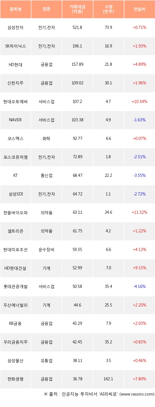 외국인 투자자의 순매수 상위 20개 종목은 삼성전자, SK하이닉스, HD현대, 신한지주, 현대오토에버, NAVER, 코스맥스, 포스코퓨처엠, KT, 삼성SDI등이다.