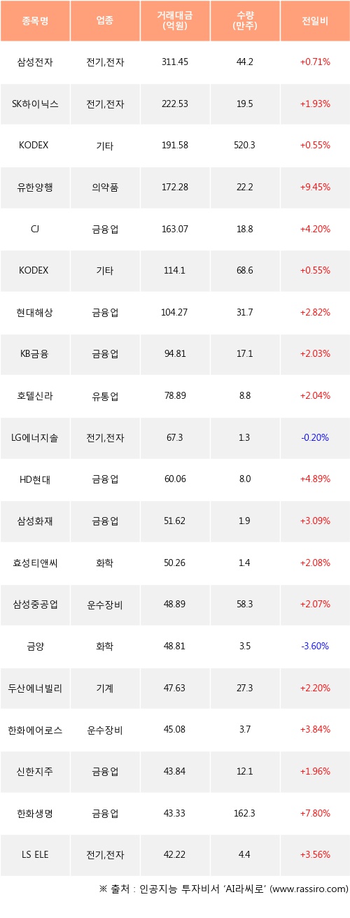 기관 투자자의 순매수 상위 20개 종목은 삼성전자, SK하이닉스, KODEX 코스닥150선물인버스, 유한양행, CJ, KODEX 레버리지, 현대해상, KB금융, 호텔신라, LG에너지솔루션등이다.